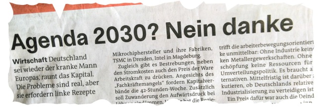 Was fordert die Titelschlagzeile der aktuellen Ausgabe (33/2023) des FREITAG da? Die Agenda 2030, die seit 2015 gültigen weltweiten Nachhaltigkeitsziele, auch unter dem Schlagwort SDGs bekannt, seien abzulehnen? Bei der Lektüre aus der Feder des Autors Ingar Solty stellt der geneigte Leser* dann aber zweierlei fest: erstens wird im Artikel selbst der Begriff der „Agenda 2030“ überhaupt nicht verwendet; und zweitens geht es auch mitnichten um die Nachhaltigen Entwicklungsziele. Der Verfasser betont in seiner Analyse lediglich Parallelen zwischen der Rhetorik kapitalseitiger Wirtschaftsvertreter*innen in den 2000er Jahren während der Auseinandersetzungen um die Agenda 2010 („Hartz Gesetze“) und der aktuellen Diskussion um die drohende Deindustrialisierung Deutschlands. Von Nachhaltigkeit ist in dem Artikel mit keinem Wort die Rede (und das allein ist mal wieder entlarvend genug…). Die Analyse der aktuellen Wirtschaftsdebatte ist insgesamt dennoch gut gelungen, soll an dieser Stelle aber nicht im Vordergrund stehen.
