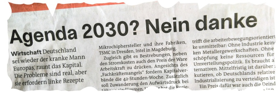 Auf all diese Themen kommt der Artikel von Ingar Solty – trotz der Schlagzeile – nicht zu sprechen. In der Online-Version auf der Webseite des FREITAG findet sich auch der etwas erhellendere, aber immer noch unrichtige Titel „Die drohende Deindustrialisierung erfordert keine Agenda 2030, sondern linke Antworten“. Ob der Autor Einfluss auf die Überschrift hatte, lässt sich aus der Ferne nicht entscheiden. Tatsächlich zeichnet sich der Artikel ansonsten ja durch eine sehr bewusste Wortwahl aus, indem nicht „die Wirtschaft“, sondern das „Kapital“, „Kapitalverbände“ sowie die „Wirtschaftspresse“ als treibende Kräfte einer neuen neoliberalen Agenda ausgemacht werden.