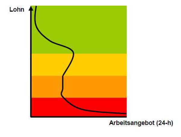 Eine realistische bzw. „wahre“ Arbeitsangebotskurve hat vier unterschiedliche Abschnitte: